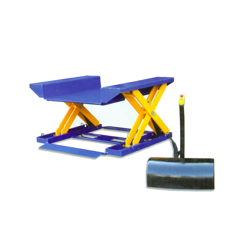 超低位落地托盘装卸货升降机,底部前后斜坡设计,方便配合叉车从地面装卸货物,无需挖基坑